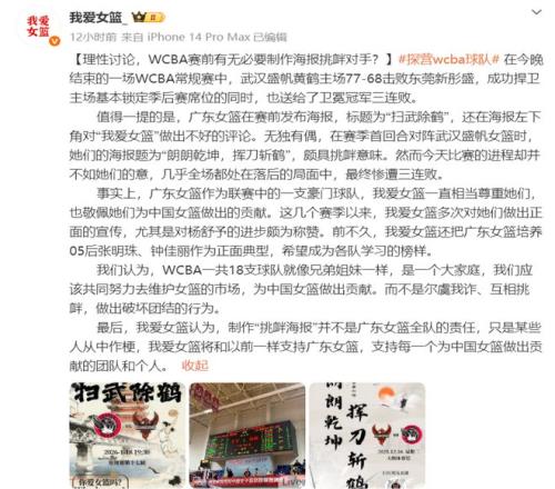 “广东女篮在赛前发布海报,标题为‘扫武除鹤’,还在海报左下角对‘我爱女篮’做出不好的评论。无独有偶,在赛季首回合对阵武汉盛帆女篮时,她们的海报题为“朗朗乾坤,挥刀斩鹤”,颇具挑衅意味。然而今天比赛的进程却并不如她们的意,几乎全场都处在落后的局面中,最终惨遭三连败。”“我爱女篮”反击道。